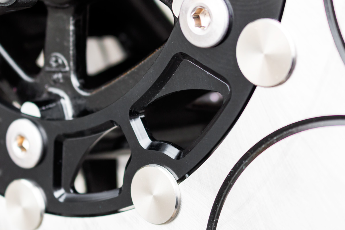 上記のアールデザインを美しく成立させるため、フロントはディスクローター自体のサイズを純正Φ300→本製品Φ310にサイズアップしています。大径のΦ320も試してみましたが収まりが余りにも悪く、最適なサイズとしてΦ310に決定しました。アウターローターは信頼のサンスター製。そして大径化により制動力が向上し、コントロール性が良くなるというメリットもあります。