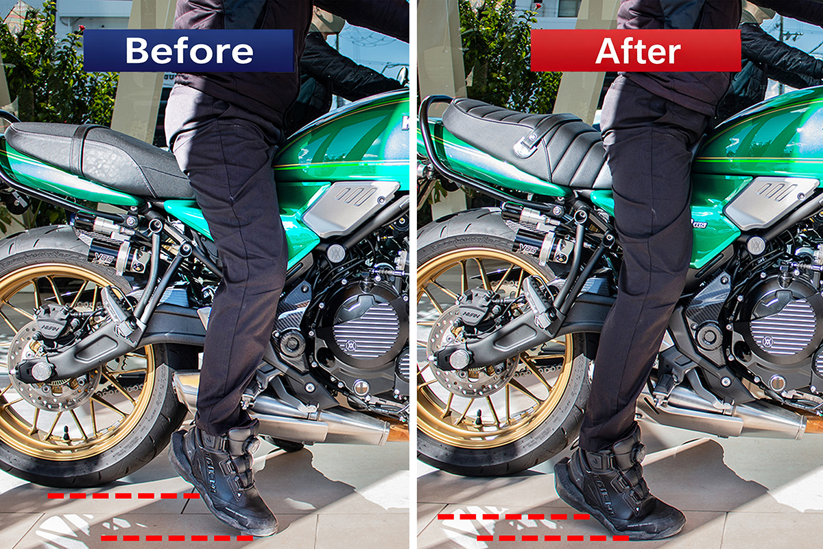 これにより足つき性が向上し、信号待ちや取り回し時の安心感が格段に高まります。