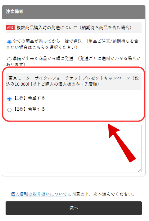 お買い物の際、【注文備考】欄で該当のボタンを選択してください。